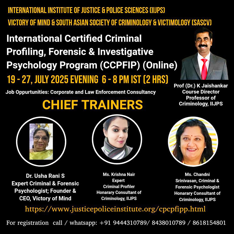 Victory of the Mind collaborated with the International Institute of Justice and Police Sciences and the South Asian Society of Criminology and Victimology to conduct an international certification program in criminal profiling and forensic psychology. The program provided participants with in depth understanding of investigative psychology, forensic assessment, victim centred perspectives, and practical applications in justice settings. Dr. S. Usharani served as Chief Trainer, bringing academic depth and field experience to the sessions. The program attracted participants globally and received strong professional appreciation for its structured and evidence based approach.
